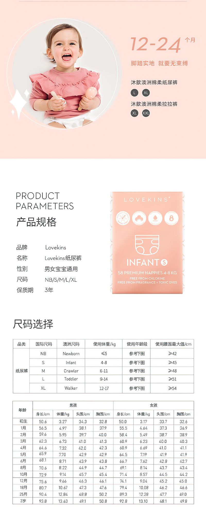 LOVEKINS diapers imported from Australia are made of pure cotton, dry, light, and thin. Baby diapers for large newborns are made of M-50 pieces per bag [6kg-11kg]